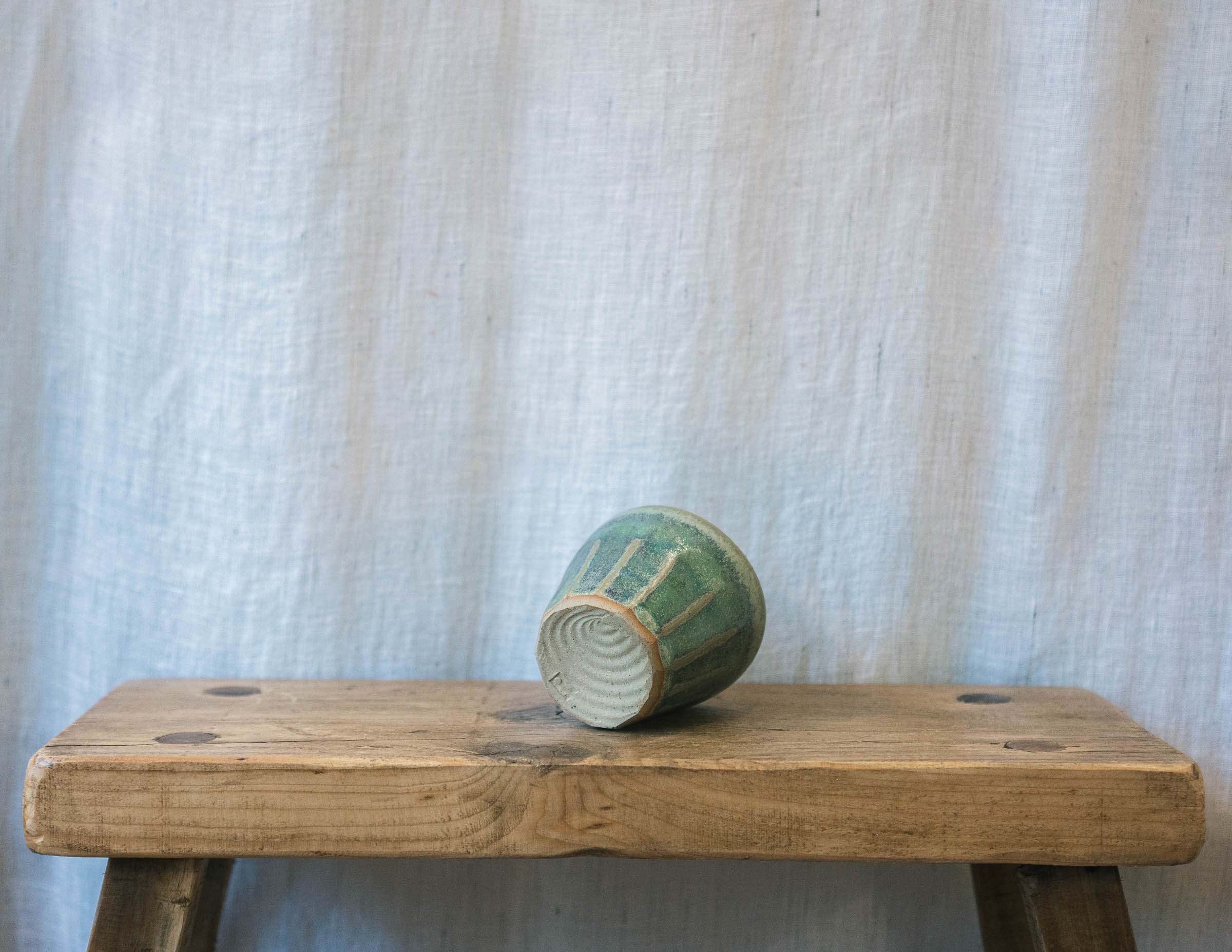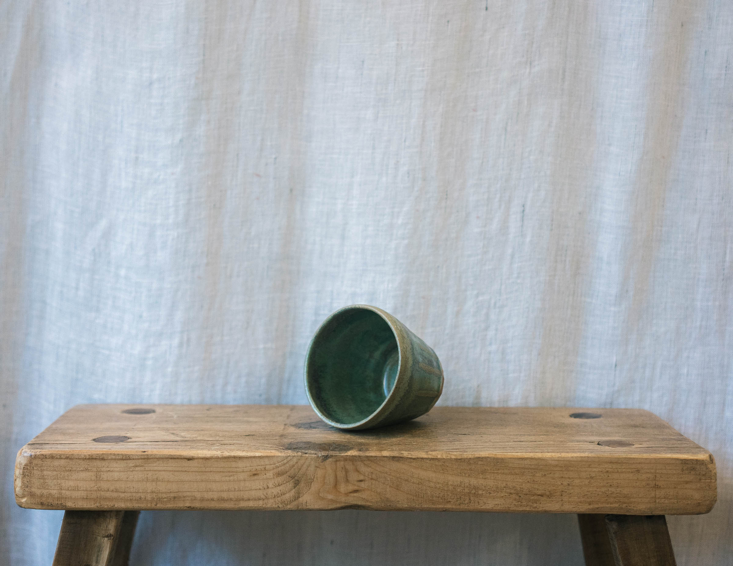Stoneware espresso tumbler in a green glaze. Deepening to blue tones where glaze is thicker.