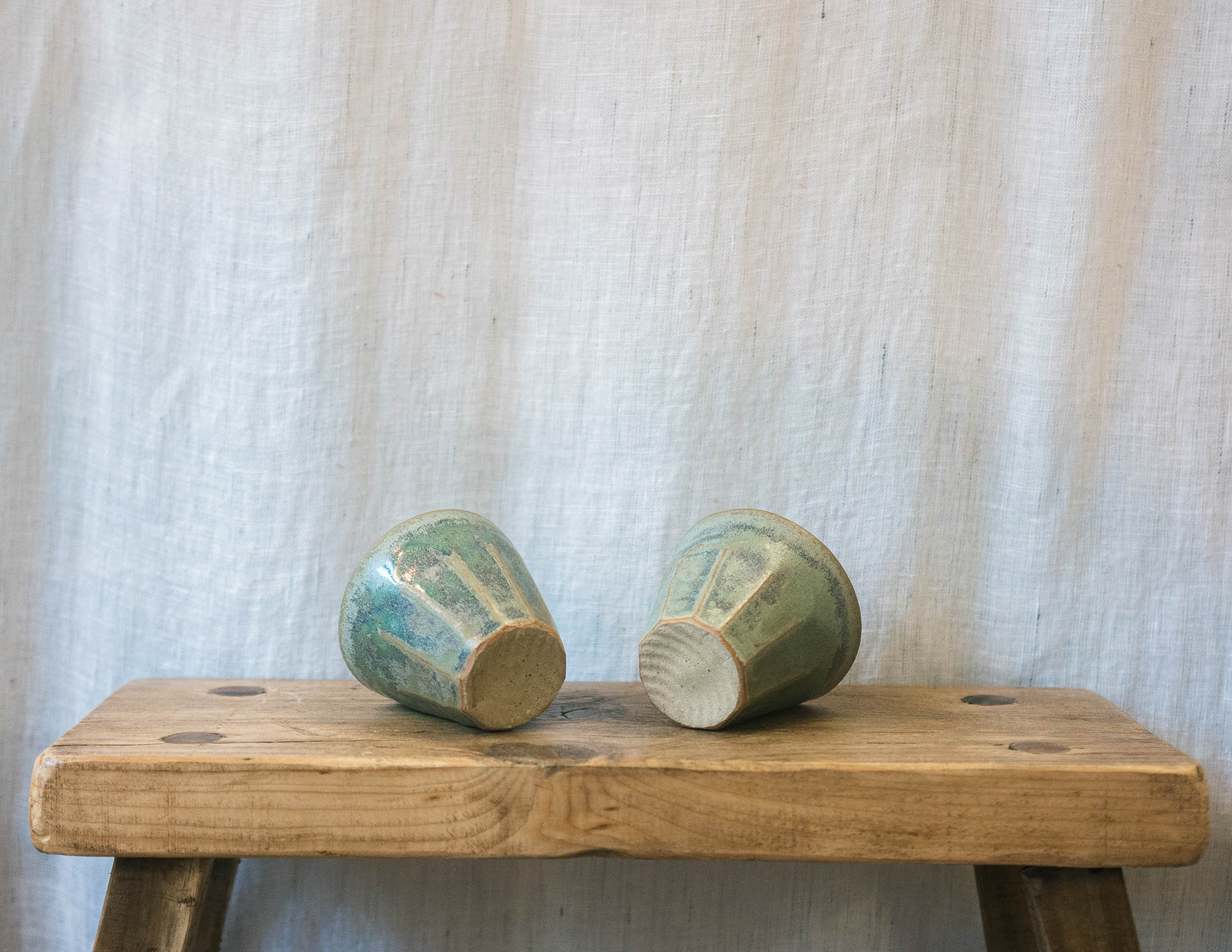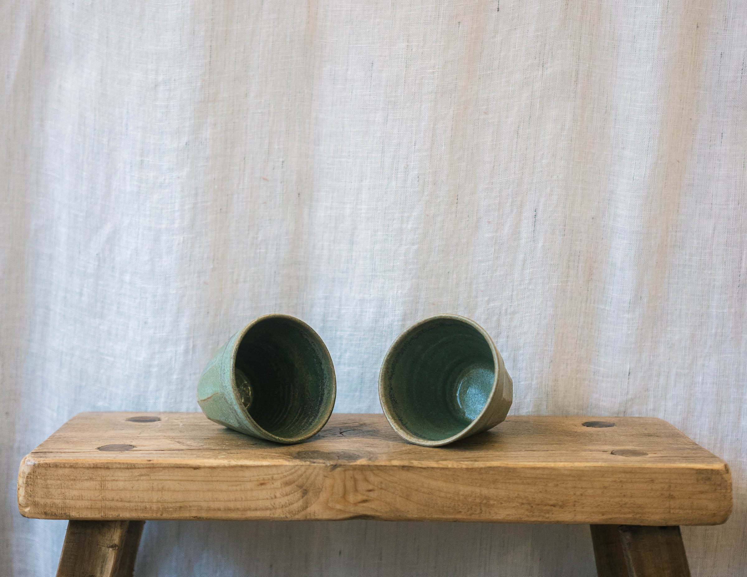 Stoneware espresso tumblers in a green glaze. Deepening to blue tones where glaze is thicker. This is a Pair of cups.
